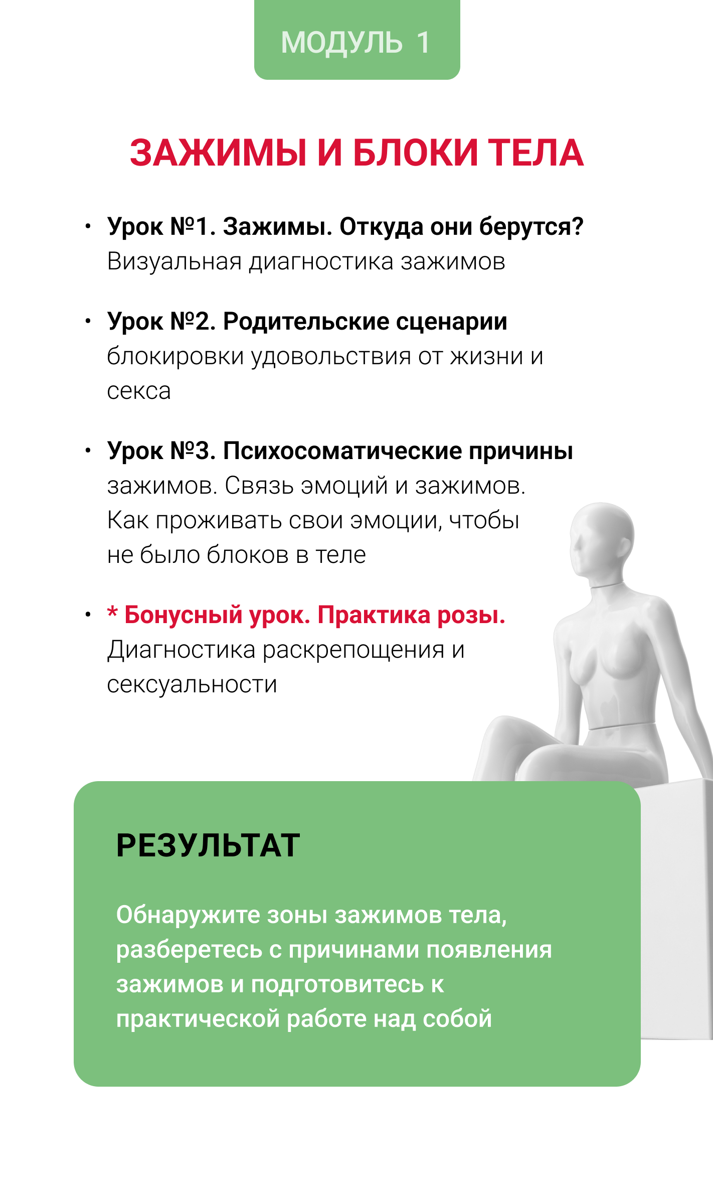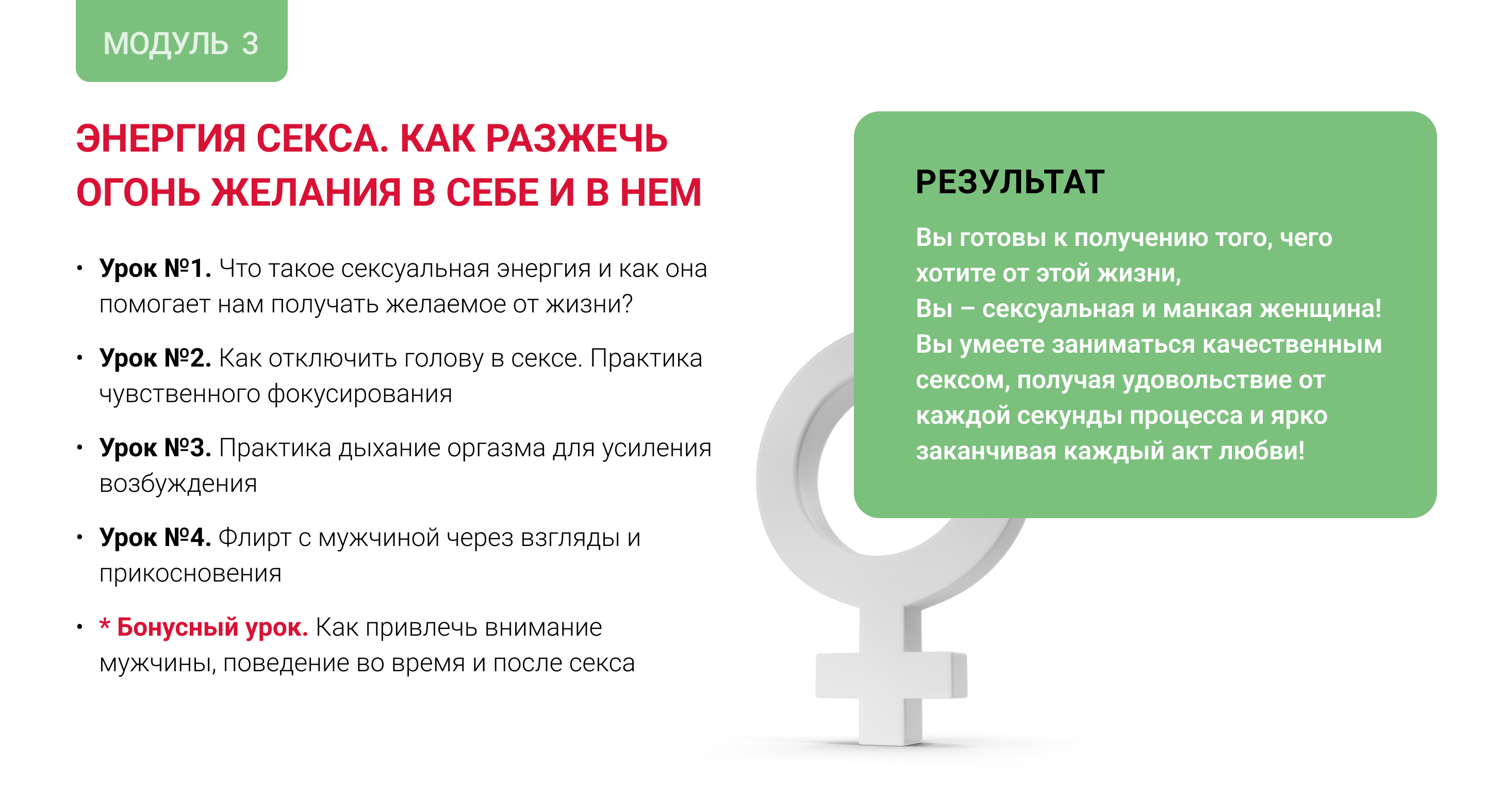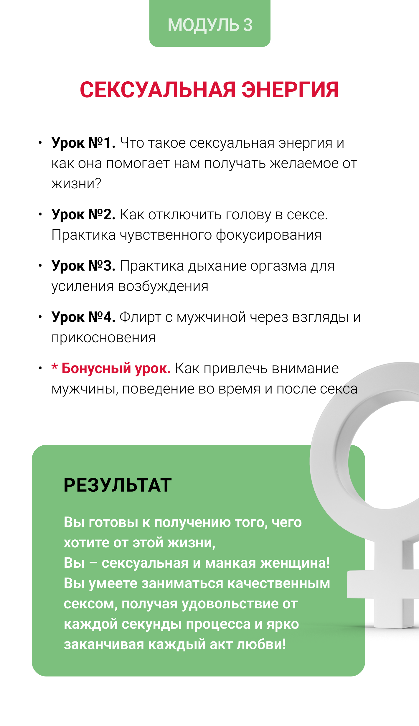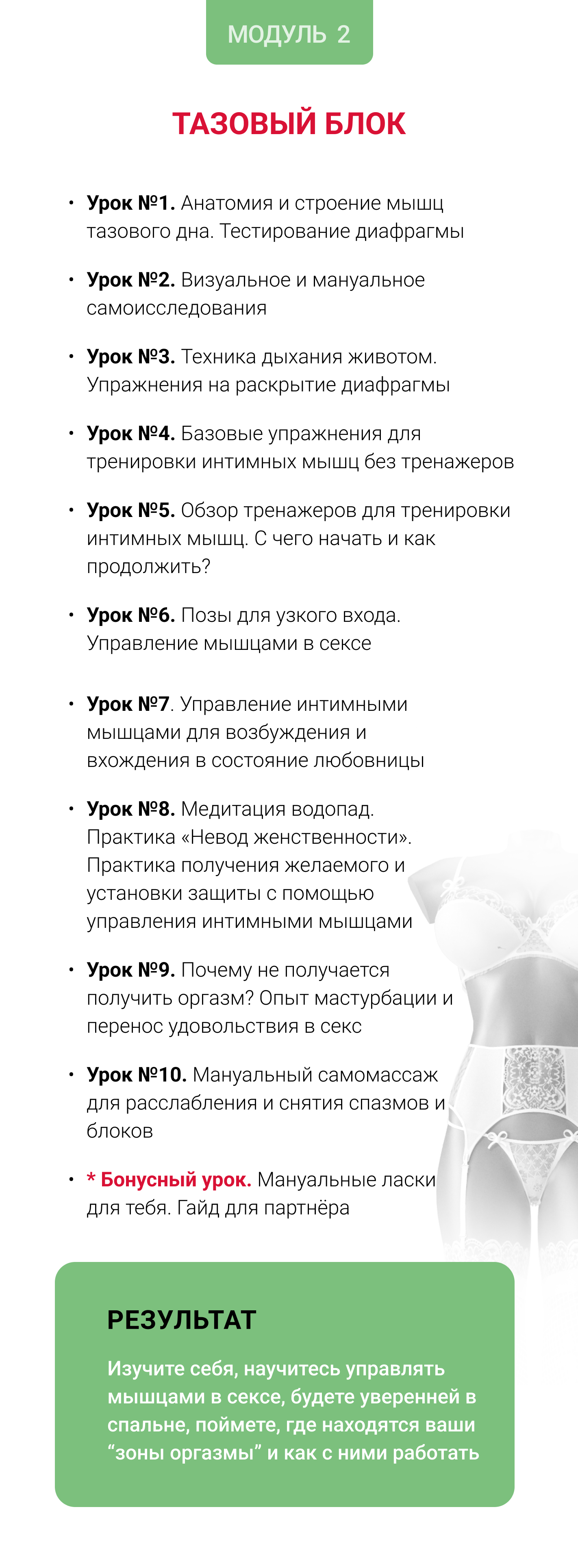 Я пересобрала и приготовила пошаговую программу 1-2-3, после прохождения которой вы проработаете свои блоки и зажимы тела, подтянете свои интимные мышцы и, как следствие, начнете получать удовольствие от секса!